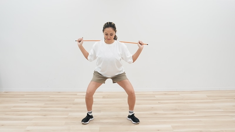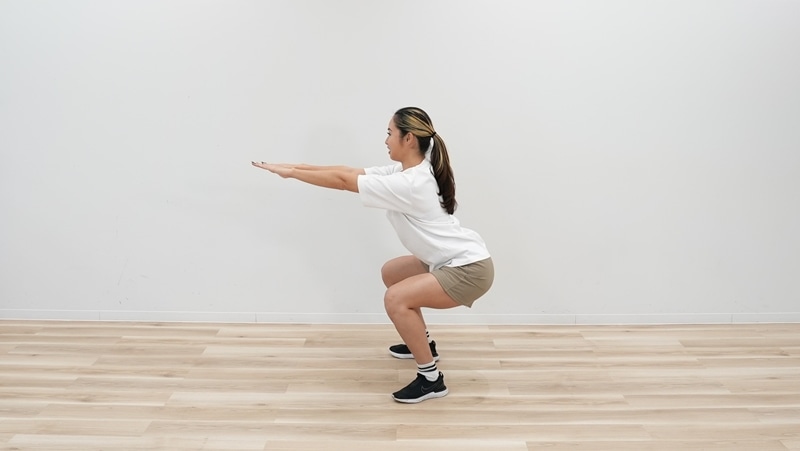 腰を軽く引きながら身体をゆっくりと下げて、スクワットの姿勢をつくる。