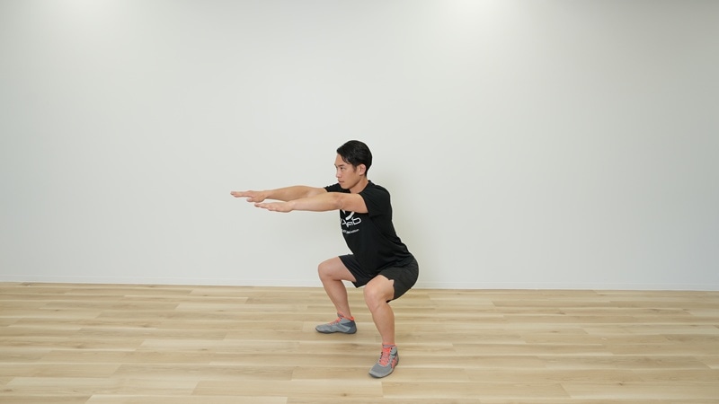 足を肩幅くらいに開いて立ち、両手は床に平行になるように前方に伸ばすか胸の前でクロスする。