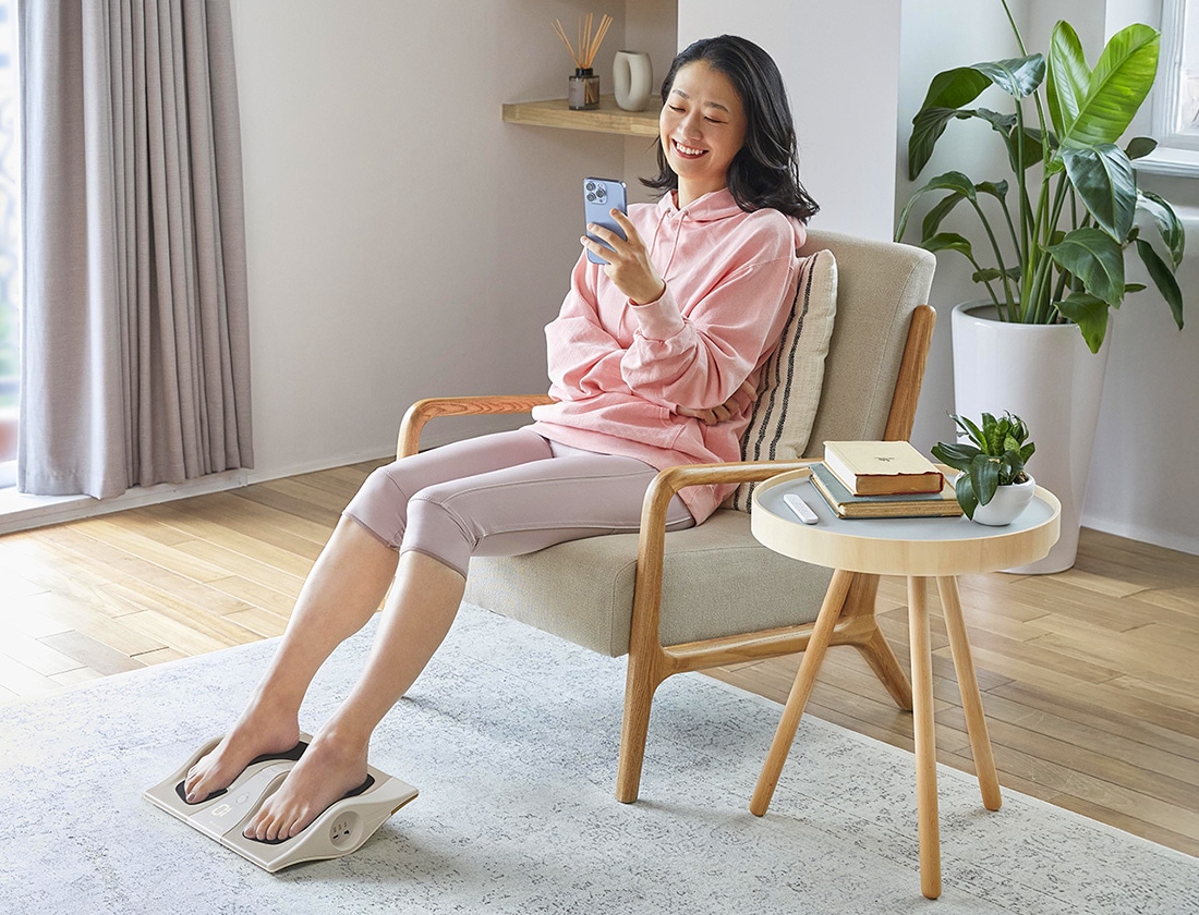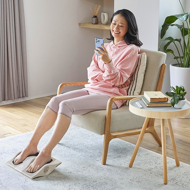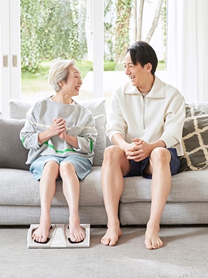 たとえば、リビングでくつろいでいるとき。読書やテレビを⾒ているとき。⾜を乗せることで、⼿軽に、⾜の筋トレができます。