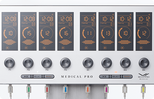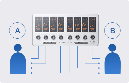 左右4チャンネルずつに分ければ、二人同時の施術も可能に。一人づつ時間差でスタートすることもでき、空きベッドなどでの機器の有効活用も可能です。