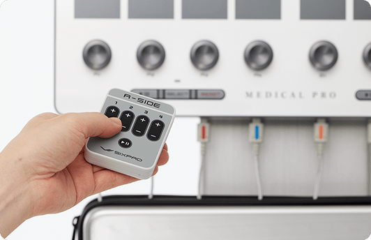 施術者が出力レベルの確認をしてブログラムをスタートした後は、お客さまご自身でレベル調整が可能。院内の手が埋まっている際にとても便利です。