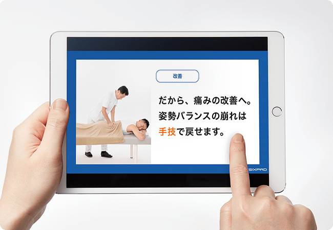 お客さまに対して、最適な施術メニューをご提案。慢性的な肩や腰の痛み、姿勢の乱れといった症状だけではなく、筋肉のトレーニングが不足している場合も。メディカルプロで幅広いニーズへの対応が可能になります。