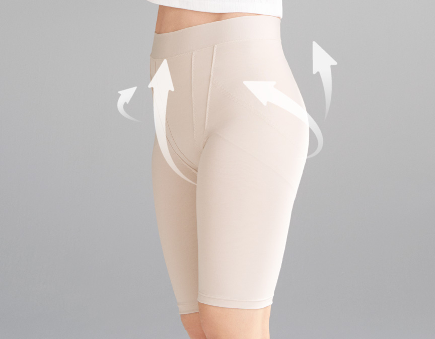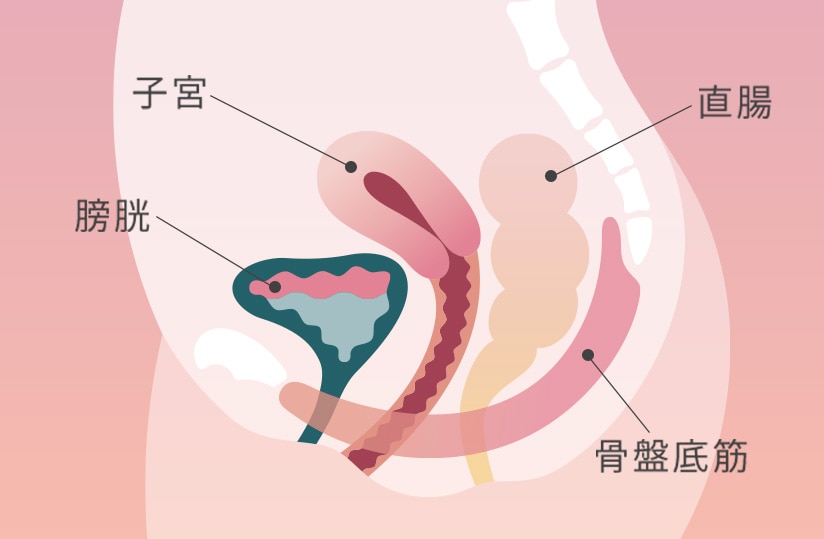 骨盤底筋に適度な圧を加えて、骨盤底筋がゆるまないように持ち上げ骨盤底筋を保護し、下垂した骨盤内臓器を正常な位置に保持します。特に下垂した膀胱を正常な位置に保ちます。